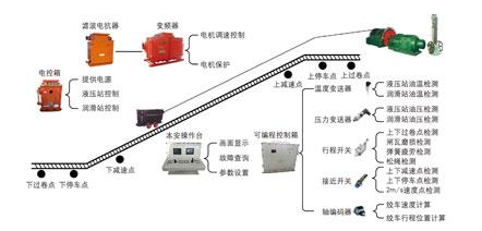當(dāng)絞車(chē)處于上行狀態(tài)時(shí),牌坊式深度指示器上的深度指針依次經(jīng)過(guò)二道風(fēng)門(mén)下控開(kāi)關(guān)、二道風(fēng)門(mén)過(guò)門(mén)監(jiān)視、二道風(fēng)門(mén)上控開(kāi)關(guān)、一道風(fēng)門(mén)下控開(kāi)關(guān)、一道風(fēng)門(mén)過(guò)門(mén)監(jiān)視、一道風(fēng)門(mén)上控開(kāi)關(guān)。對(duì)應(yīng)上述過(guò)程的具體動(dòng)作依次為:二道風(fēng)門(mén)開(kāi)、絞車(chē)經(jīng)過(guò)二道風(fēng)門(mén)、二道風(fēng)門(mén)關(guān)、一道風(fēng)門(mén)開(kāi)、絞車(chē)經(jīng)過(guò)一道風(fēng)門(mén)、一道風(fēng)門(mén)關(guān)。(3)風(fēng)門(mén)安全回路
