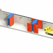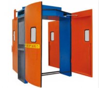 一套安全聯(lián)鎖減壓風(fēng)門有四個反風(fēng)門和四個正風(fēng)門及2組框架結(jié)構(gòu)的門框組成,頂部橫梁呈三角形結(jié)構(gòu),門扇與風(fēng)壓流向成一定的夾角,把壓在門扇上的壓力分解一部分除去,減輕開閉門扇需要的力氣。門扇大部分要求表面為弧形增強(qiáng)抗壓性能,在門扇上有行人小門和觀察窗,單獨是行人通過時沒有必要把這么大的門扇都打開,只是從行人小門經(jīng)過即可。