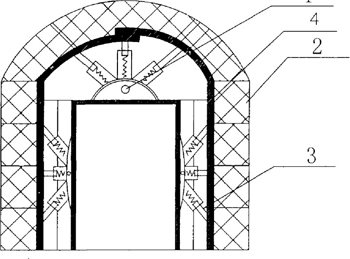可縮式風流控制風門一種抗高壓礦用風門,抗地壓和風壓不變形等特點,由門框和擋風門組成,在門框的左右兩側框上設置有由內密封板構成的槽型內密封組合墻,在槽型內密封組合墻的外側套裝有由外密封板和可縮密封層支撐板構成外內密封組合墻,在內密封組合墻和外內密封組合墻之間的空隙中通過設置在門框外側的軸座和安裝在其上的固定軸安裝有多個可縮支柱,左右兩側的可縮密封層支撐板在上部的連接方式為搭接,在門框的上部通過軸座和安裝在其上的固定軸安裝有多個可縮支柱,在可縮密封層支撐板的兩外側和上部是由可縮性材料圍城的可縮密封層。它是一種在煤礦井下壓力出現變化時不變形的可縮性風門。